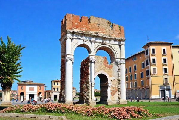 Арка императора Августа — легендарная достопримечательность, которой уже больше двух тысячелетий. Несколько веков назад она служила южными городскими воротами в крепостных стенах. Фундамент ворот тоже сохранился, он расположен недалеко от самой арки. Рассматривая исторический памятник, можно заметить рельефные медальоны с изображениями четырех богов: Нептуна, Зевса, Аполлона, Миневры. В верхней части арки раньше располагался император управляющий лошадьми, а сегодня здесь можно заметить зубчатое навершие.